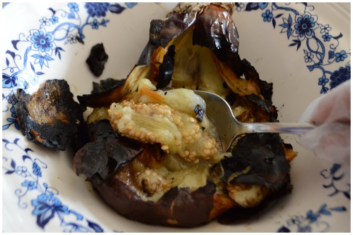 - Cut a slit in the eggplant and roast on the stove top or on your outdoor grill, cook, turning occasionally with tongs, until completely tender and well charred on all sides. Set aside until it cools down. See notes for other cooking options. (Note2)