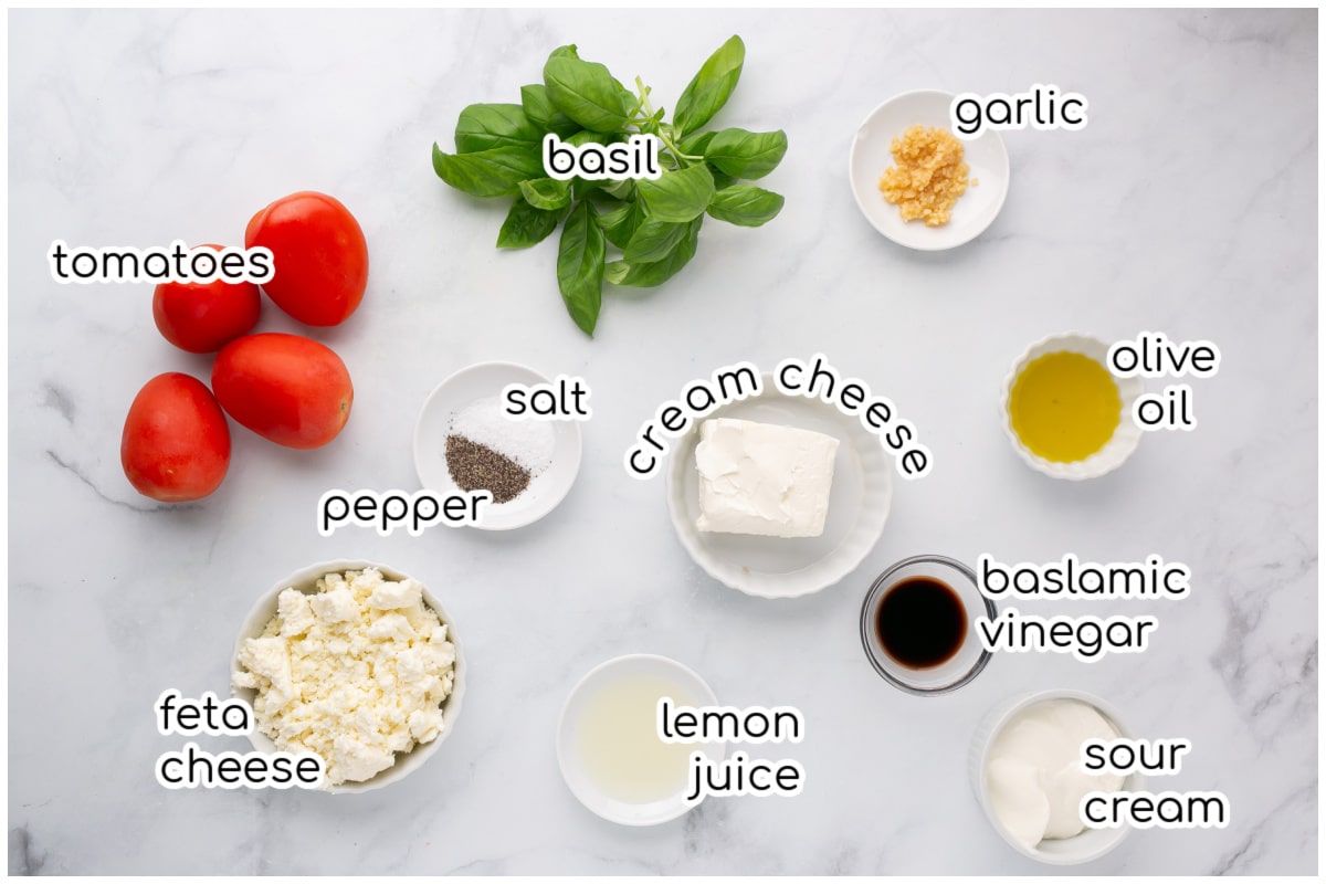 Gather your fresh ingredients, look for fresh basil that is bright green and has a strong aroma. The combination of feta, sour cream, and cream cheese gives the perfect consistency and tangy creamy taste.