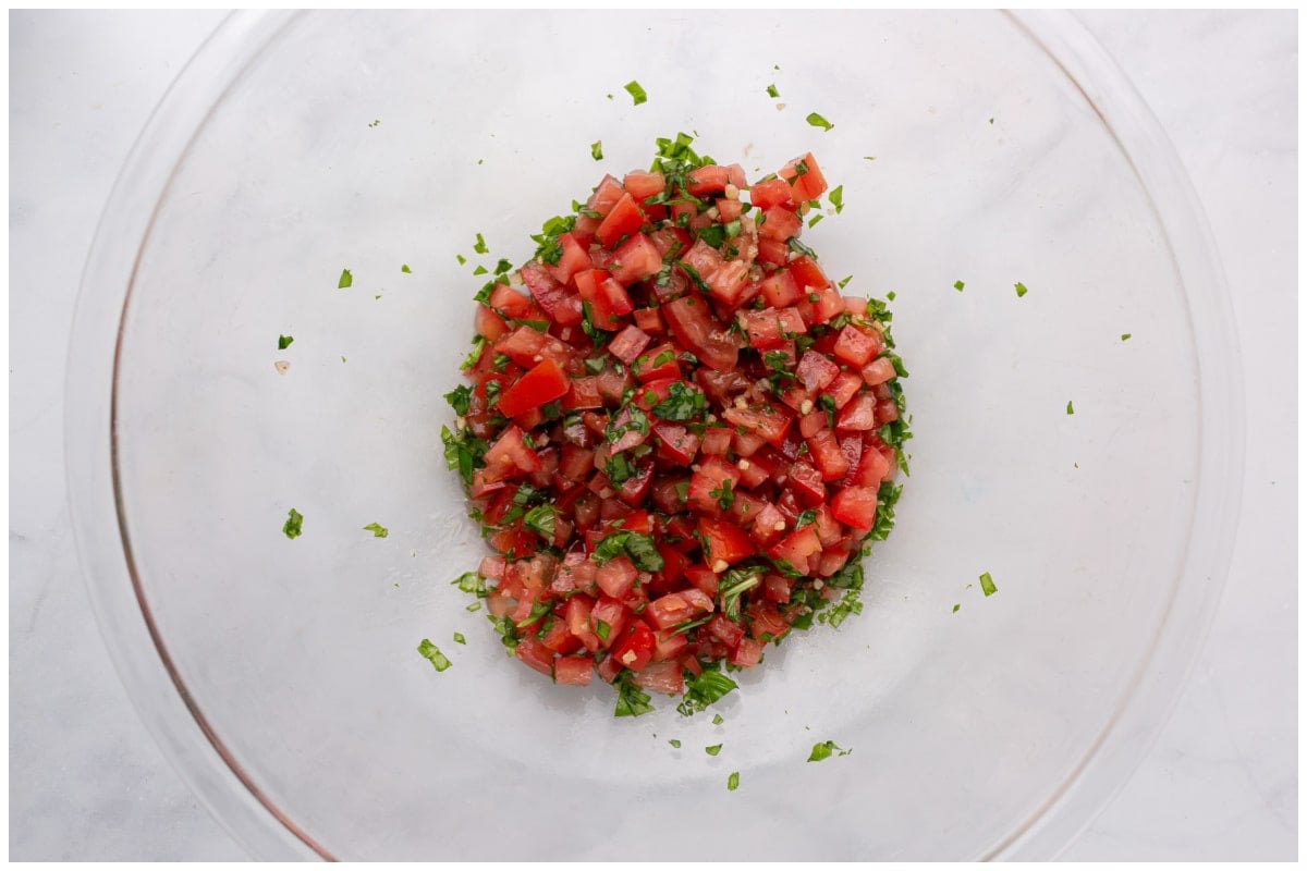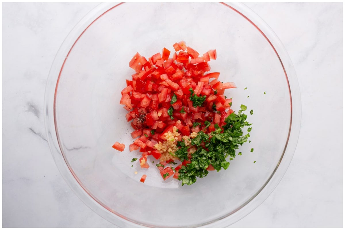 Place the diced tomatoes into a medium-sized mixing bowl. Add the chopped fresh basil, minced garlic, extra virgin olive oil, and balsamic vinegar.