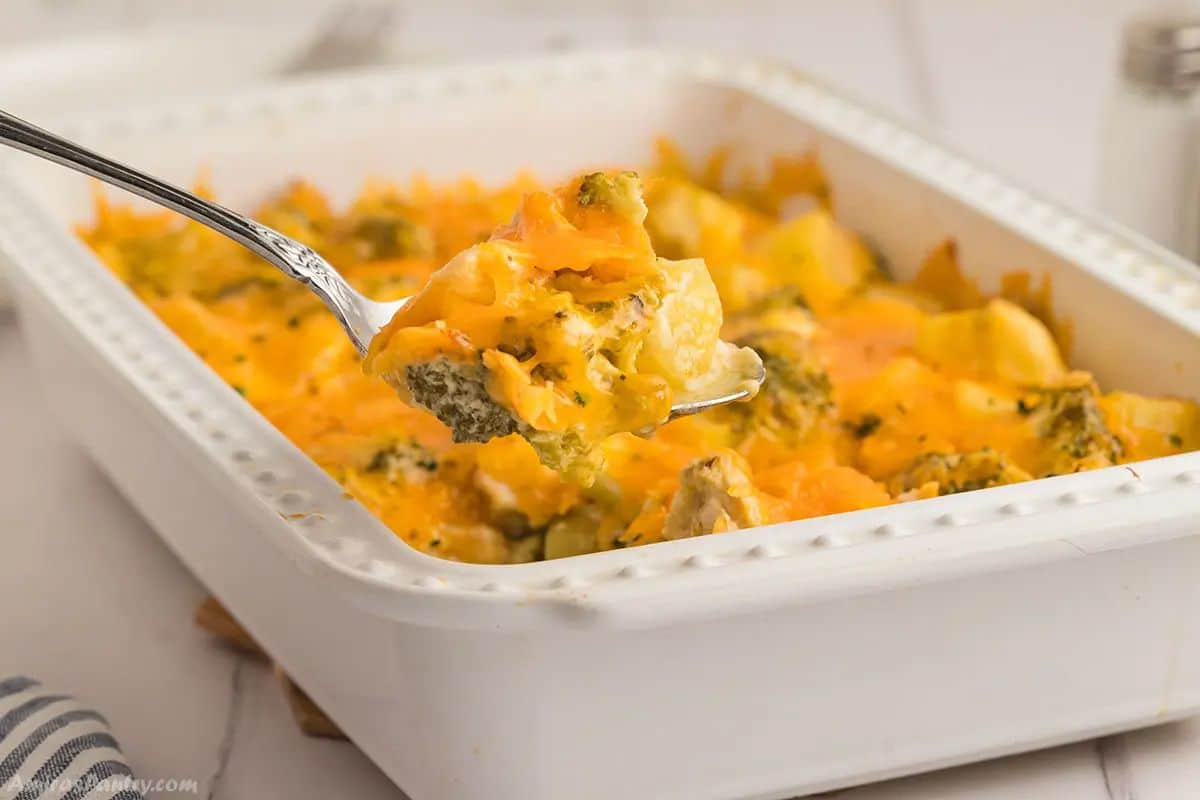 Chicken broccoli casserole is an easy recipe loaded with chunks of chicken, fresh broccoli, and tender potatoes in a cheesy, creamy sauce. Easily cooked in your oven, this delicious meal is great for a busy weeknight.