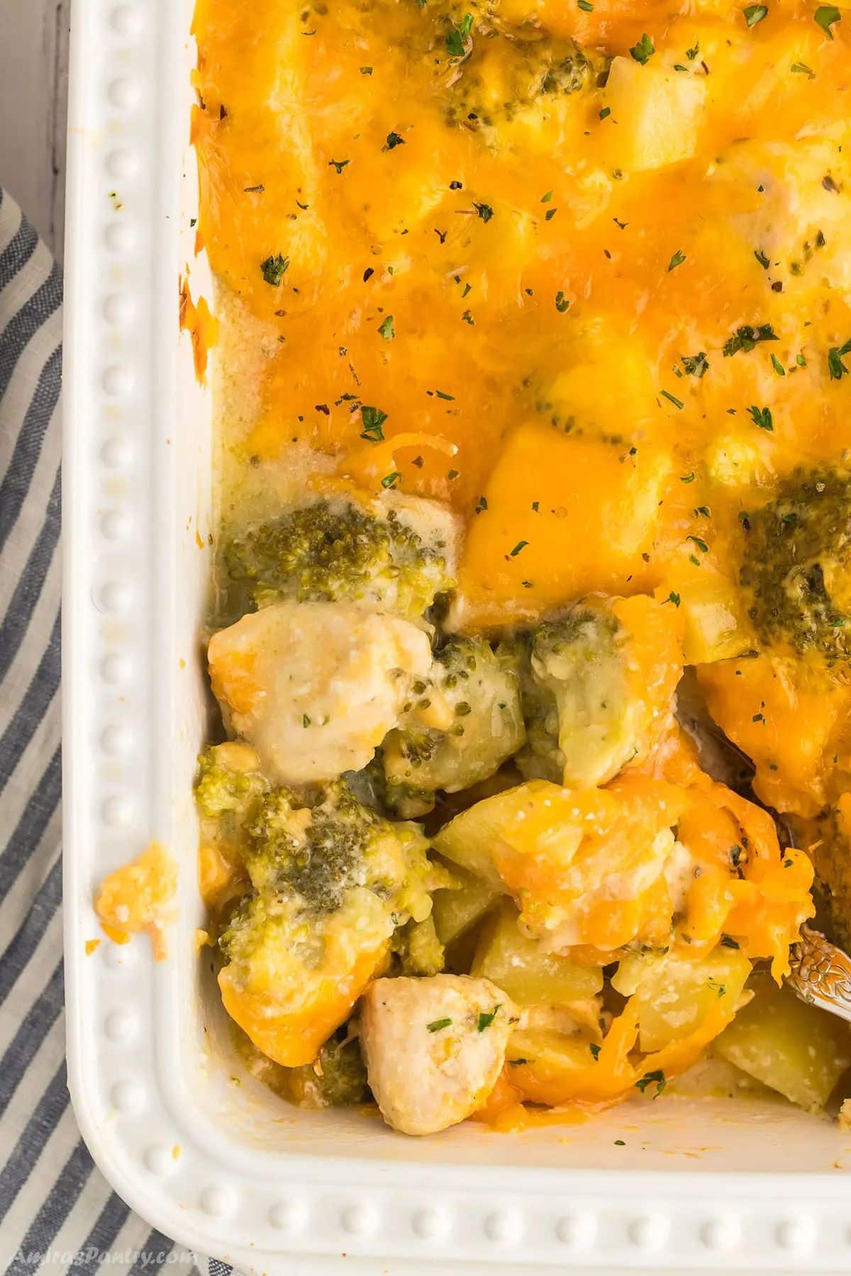 Chicken broccoli casserole is an easy recipe loaded with chunks of chicken, fresh broccoli, and tender potatoes in a cheesy, creamy sauce. Easily cooked in your oven, this delicious meal is great for a busy weeknight.