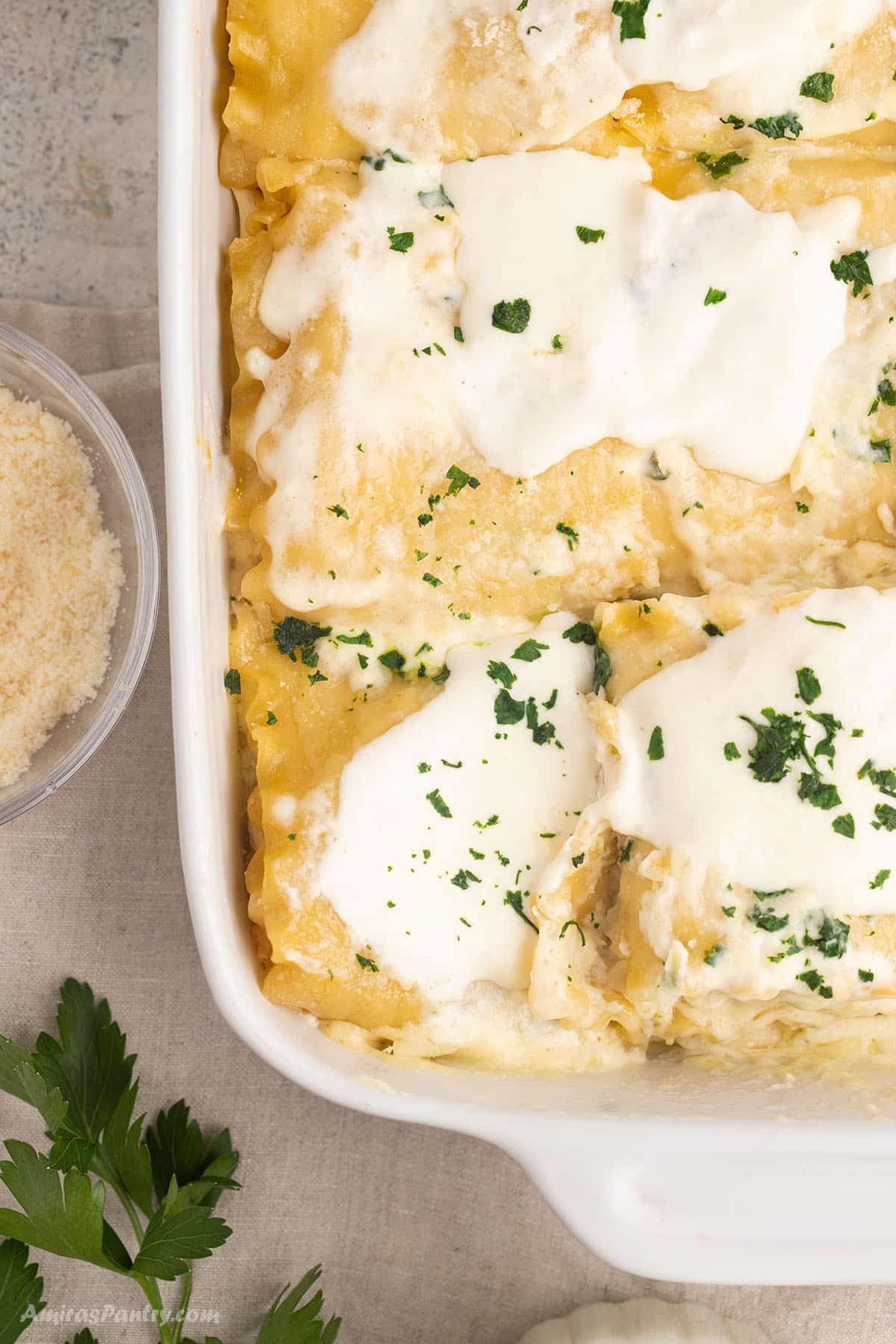 - To prepare the filling, mix the ricotta cheese and parsley into the bowl with the reserved Alfredo sauce.