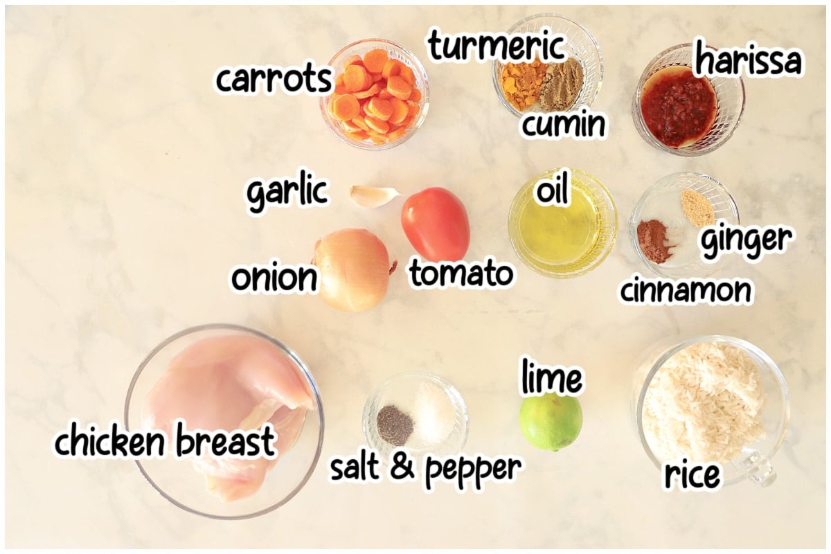 - In a large bowl, mix together chicken, harissa, lime juice, turmeric, cumin, ginger powder, salt, black pepper, garlic and two tablespoons of oil.